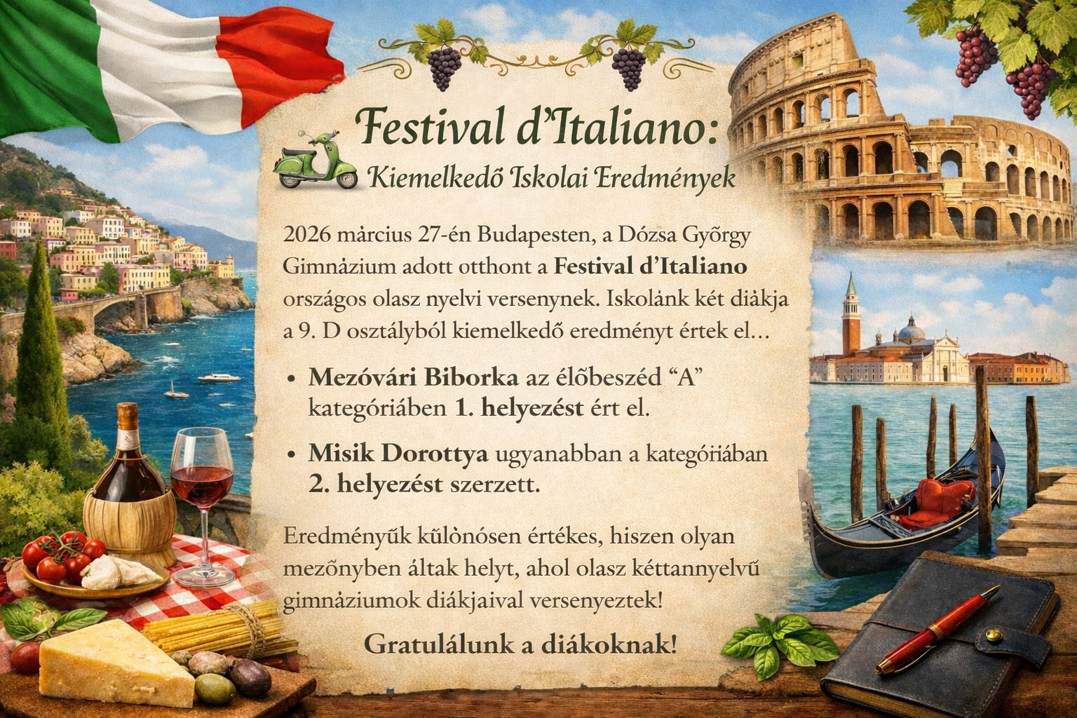 202.6 március 27-én Budapesten a Dózsa György Gimnázium adott otthont a Festival d’Italiano országos olasz nyelvi versenynek. Iskolánk két diákja a 9. D osztályból kiemelkedő